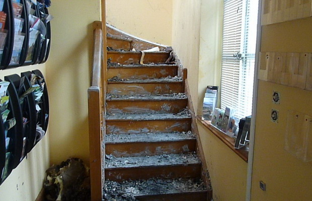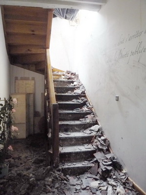escaliers dont un est d’époque, semblent être épargnés par le feu, mais sont également couverts de débris. Le mur près de l’escalier ancien est particulièrement sali par la fumée et l’eau.