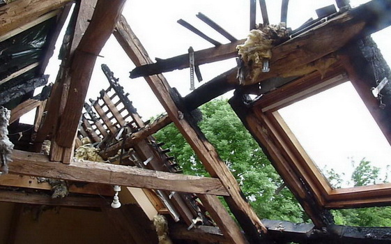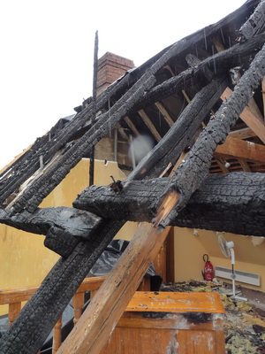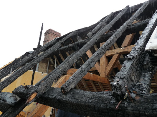 a été gravement endommagée: plus de la moitié en est brûlée, seule la partie la plus éloignée du foyer de l’incendie a été épargnée. Beaucoup de poutres