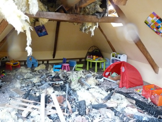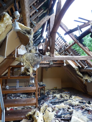 Les dégâts causés par le feu, sont, hélas, importants. L'établissement du bilan exact des dommages est encore en cours, mais il semblerait dès à présent que le toit, ainsi que le premier étage du bâtiment,